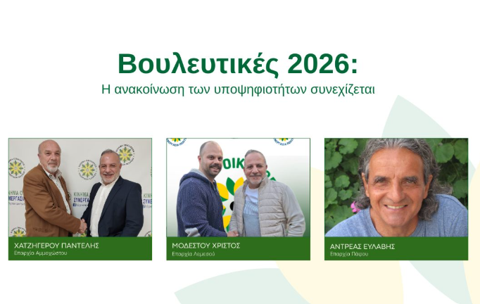 ΕΚΛΟΓΕΣ 2026 Τρία νέα πρόσωπα από το Κίνημα Οικολόγων για τις Βουλευτικές Για επαρχίες Λεμεσού, Πάφου και ΑμμοχώστουΤρεις νέες υποψηφιότητες για τις Βουλευτικές Εκλογές του 2026 ανακοίνωσε το Κίνημα Οικολόγων – Συνεργασία Πολιτών στις επαρχίες Λεμεσού, Πάφου και … January 15, 2026• Α.Κ.Ε.Λ.-Αριστερά-Νέες Δυνάμεις ΑΚΕΛ | Τι χρωστάτε τελικά στον φασίστα φονιά Νετανιάχου; September 22, 2025• Εθνικό Λαϊκό Μέτωπο (Ε.ΛΑ.Μ.) Το Εθνικό Λαϊκό Μέτωπο ανακοινώνει την υποψηφιότητα της Λευκής Στυλιανού για την Επαρχία Λευκωσίας December 10, 2025• ΕΚΛΟΓΕΣ 2026 Ψηφίστηκε το νομοσχέδιο για τις έδρες: Πάφος αποκτά 5, Λευκωσία 19 – Τέλος η μονοσταυρία December 5, 2025• Ολοκληρωμένη στρατηγική για μια επιτυχημένη υποψηφιότητα Ξεκίνα από Εδώ ΑΝΤΙΣΤΡΟΦΗ ΜΕΤΡΗΣΗ ΓΙΑ ΤΗΝ ΜΕΡΑ ΤΗΣ ΚΑΛΠΗΣ ΗΜΕΡΕΣ 0 ΩΡΕΣ 0 ΛΕΠΤΑ 0 ΔΕΥΤ. 0 ΥΠΟΨΗΦΙΟΙ ΚΟΜΜΑΤΑ Εγγραφείτε για τις τελευταίες ειδήσεις και ενημερώσεις!