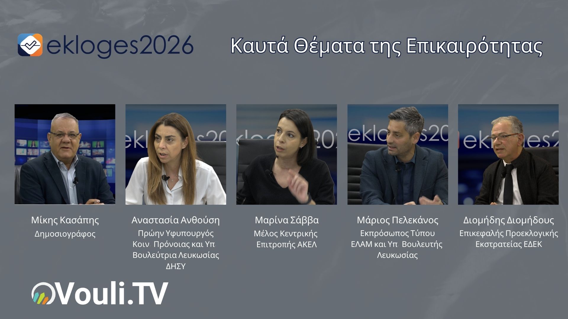 Αναστασία Ανθούση (Πρώην Υφυπουργός Πρόνοιας – υποψήφια βουλευτής ΔΗΣΥ), Μαρίνα Σάββα (Μέλος της Κεντρικής Επιτροπής ΑΚΕΛ), Διομήδης Διομήδους (Επικεφαλής της προεκλογικής εκστρατείας της ΕΔΕΚ) και Μάριος Πελεκάνος (Εκπρόσωπος τύπου ΕΛΑΜ – υποψήφιος βουλευτής).