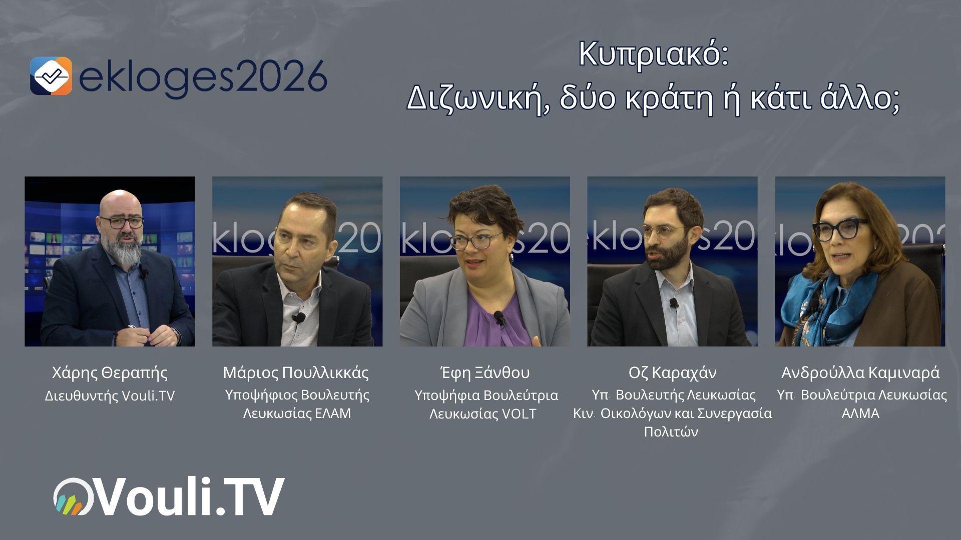 Οι εξελίξεις γύρω από το Κυπριακό και οι γεωπολιτικές ανακατατάξεις στην περιοχή αποτέλεσαν το βασικό αντικείμενο της εκπομπής Ekloges 2026, με παρουσιαστή τον Χάρη Θεραπή, όπου συζητήθηκαν οι διαφορετικές προσεγγίσεις των κομμάτων ως προς τη μορφή λύσης του Κυπριακού και τα μοντέλα που τίθενται στο τραπέζι της δημόσιας συζήτησης.