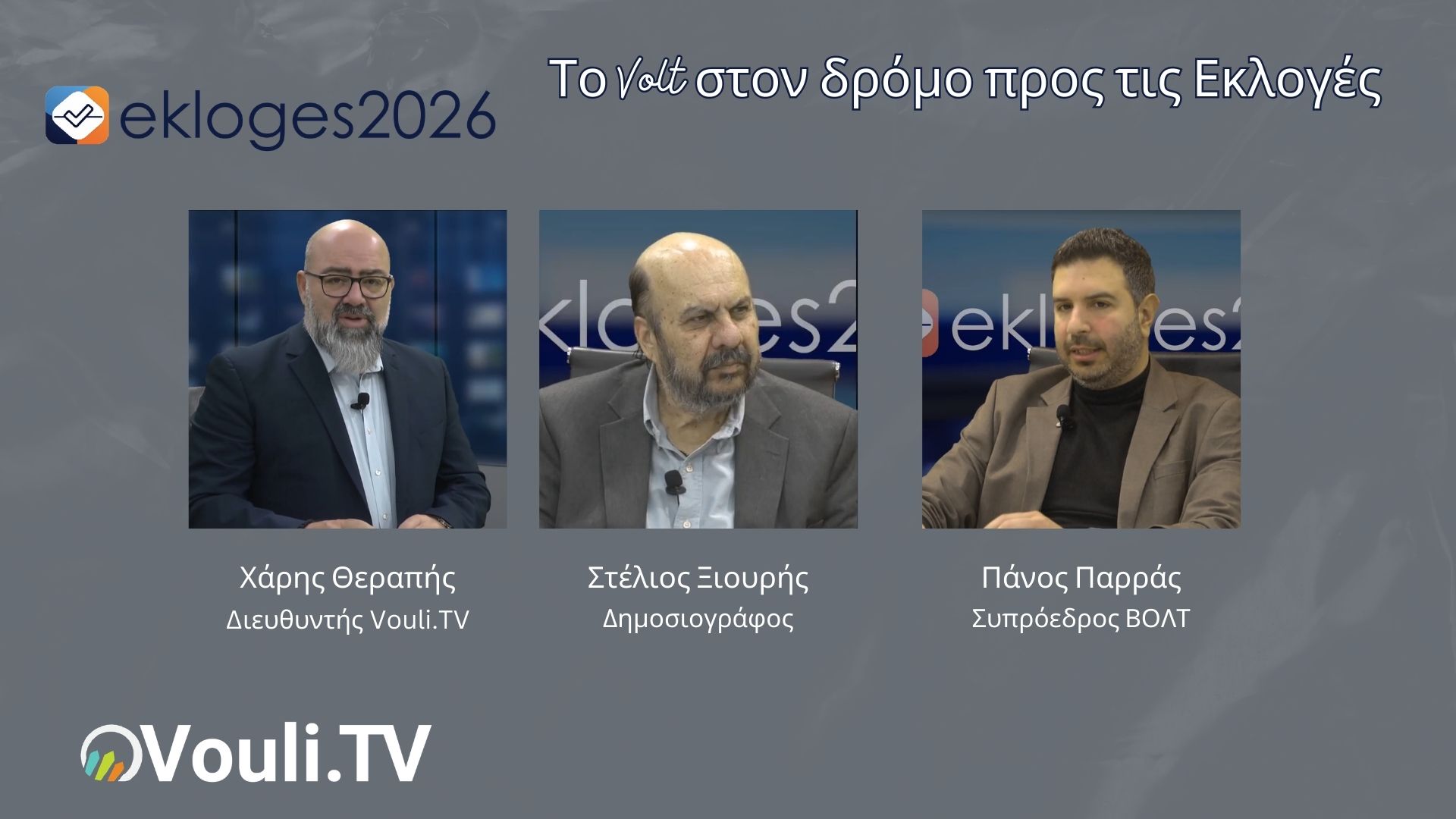 Ο συμπρόεδρος του Volt, Πάνος Παρράς, φιλοξενήθηκε στο στούντιο της εκπομπής Ekloges 2026, όπου συζήτησε τις θέσεις του κόμματος για σημαντικά ζητήματα της επικαιρότητας, καθώς και τις πολιτικές εξελίξεις ενόψει των επερχόμενων εκλογών. Η συζήτηση πραγματοποιήθηκε με τους Χάρη Θεραπή και Στέλιο Ξιούρη, εστιάζοντας στο πολιτικό σκηνικό και τις προτεραιότητες του Volt για την επόμενη περίοδο.