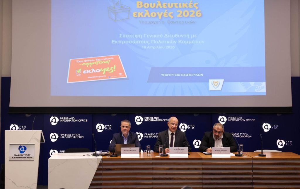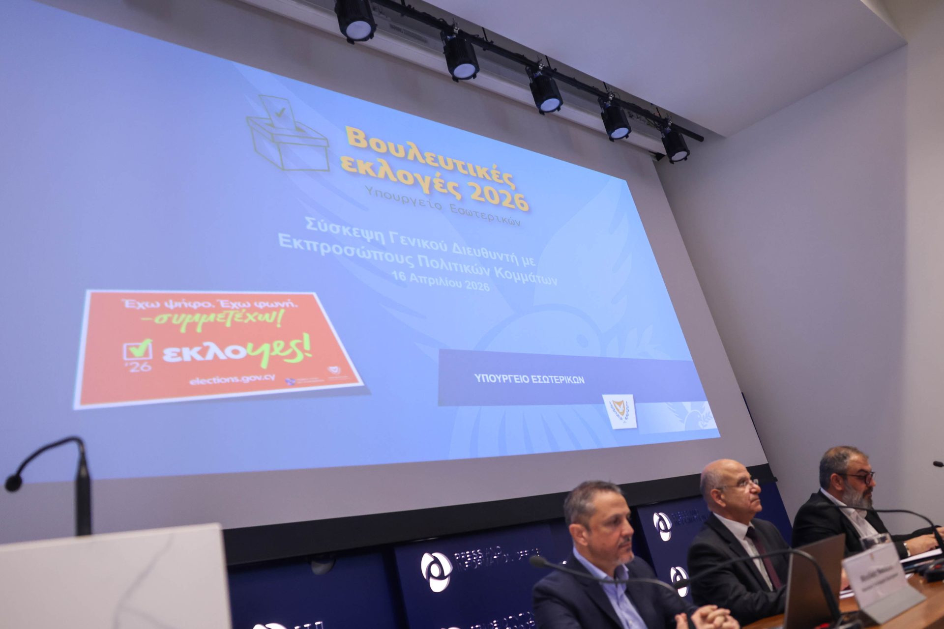 Ο Γενικός Διευθυντής του Υπουργείου Εσωτερικών δρ. Ελίκκος Α. Ηλία πραγματοποίησε σήμερα Πέμπτη, 16 Απριλίου 2026, σύσκεψη με εκπροσώπους των πολιτικών κομμάτων, κατά την οποία συζητήθηκαν θέματα που αφορούν στις επικείμενες Βουλευτικές Εκλογές της 24ης Μαΐου 2026.
